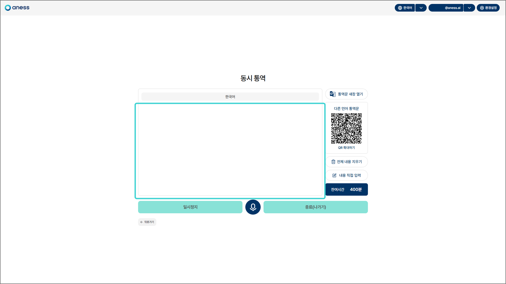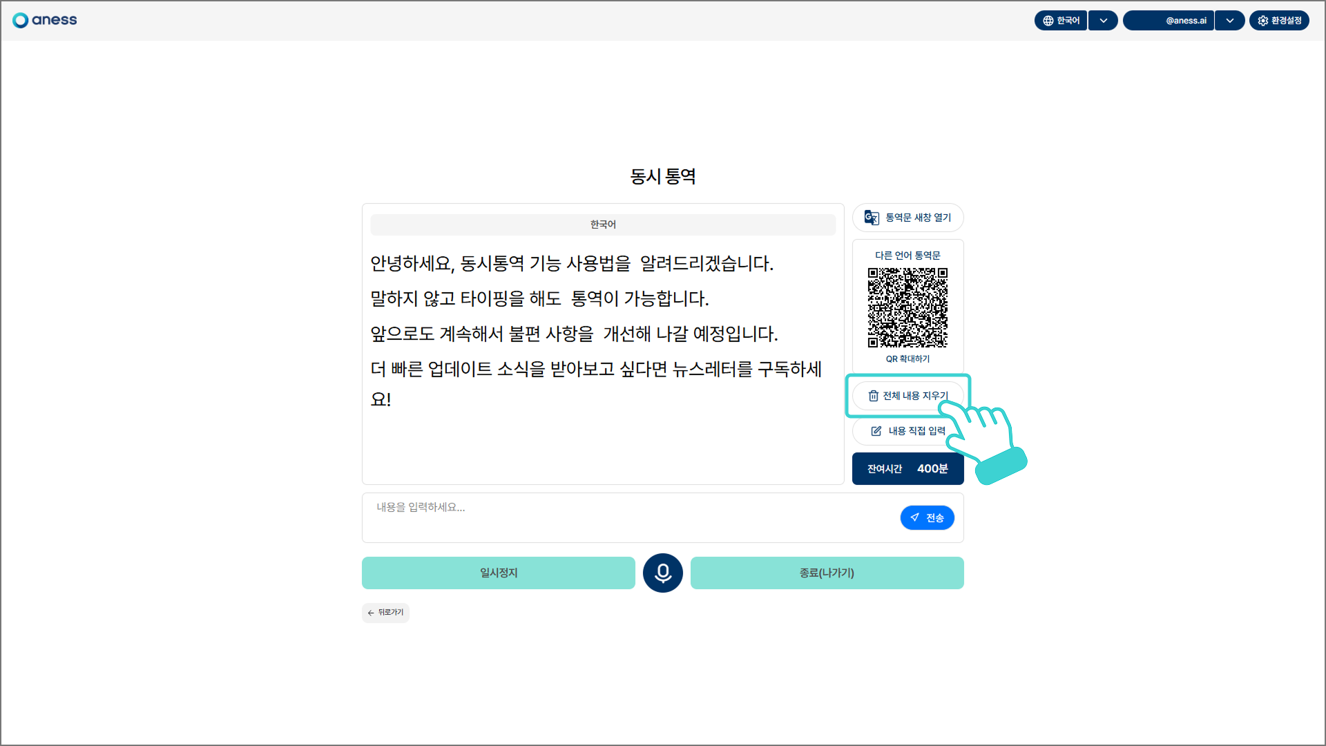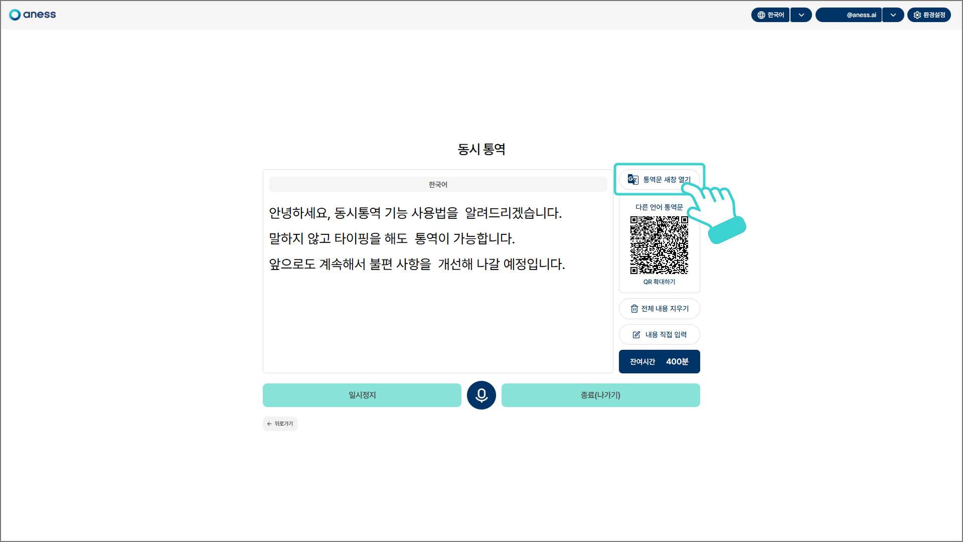 기존 발화 내용을 지우고 일시정지를 했다가 재시작하면, 통역창을 나가지 않아도 화면을 정리한 뒤 새로 시작할 수 있습니다.
