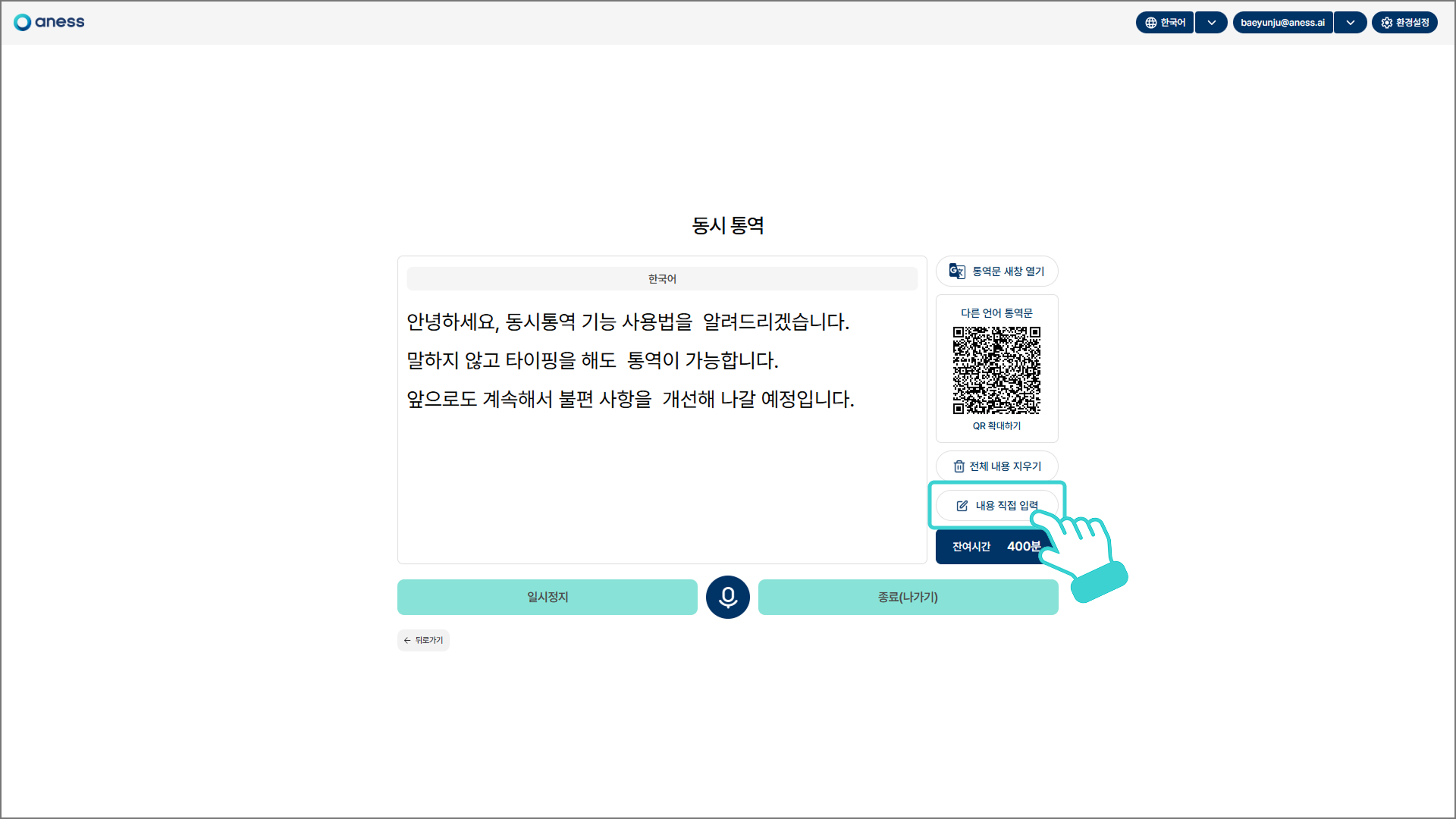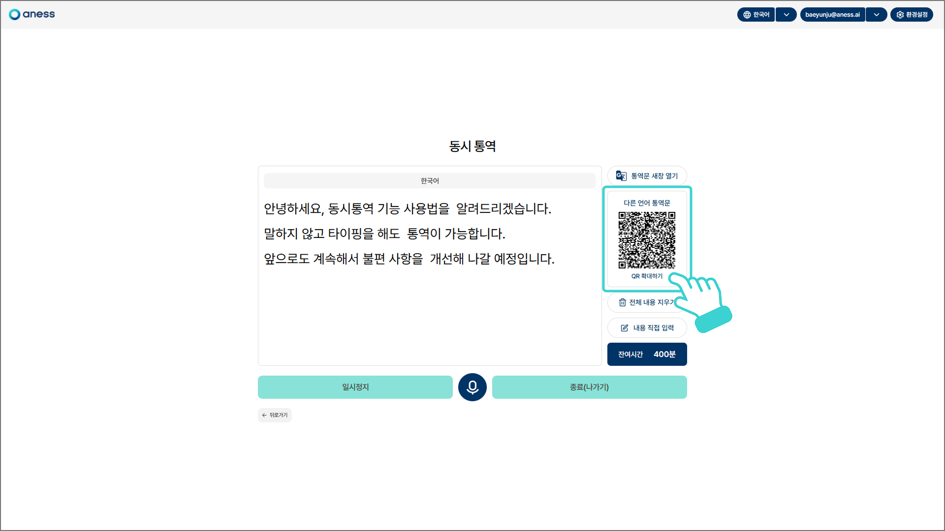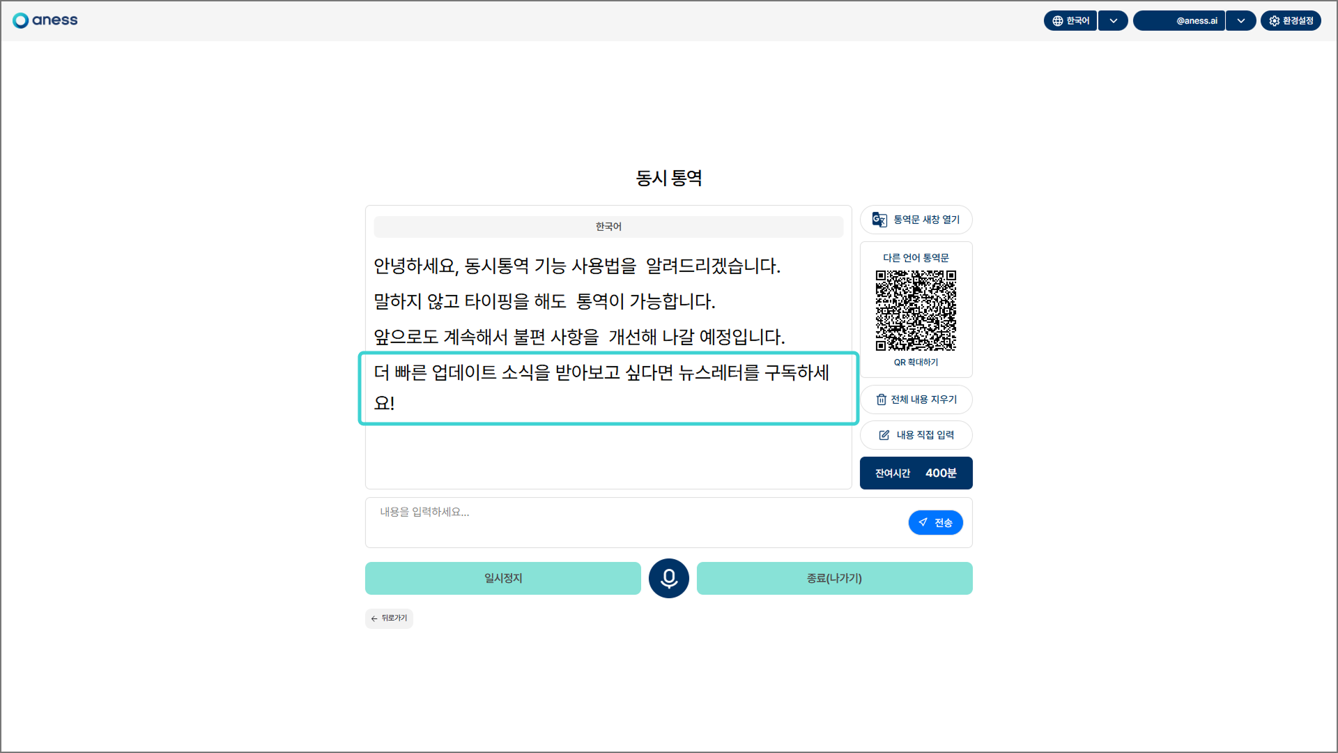 기존 발화 내용을 지우고 일시정지를 했다가 재시작하면, 통역창을 나가지 않아도 화면을 정리한 뒤 새로 시작할 수 있습니다.