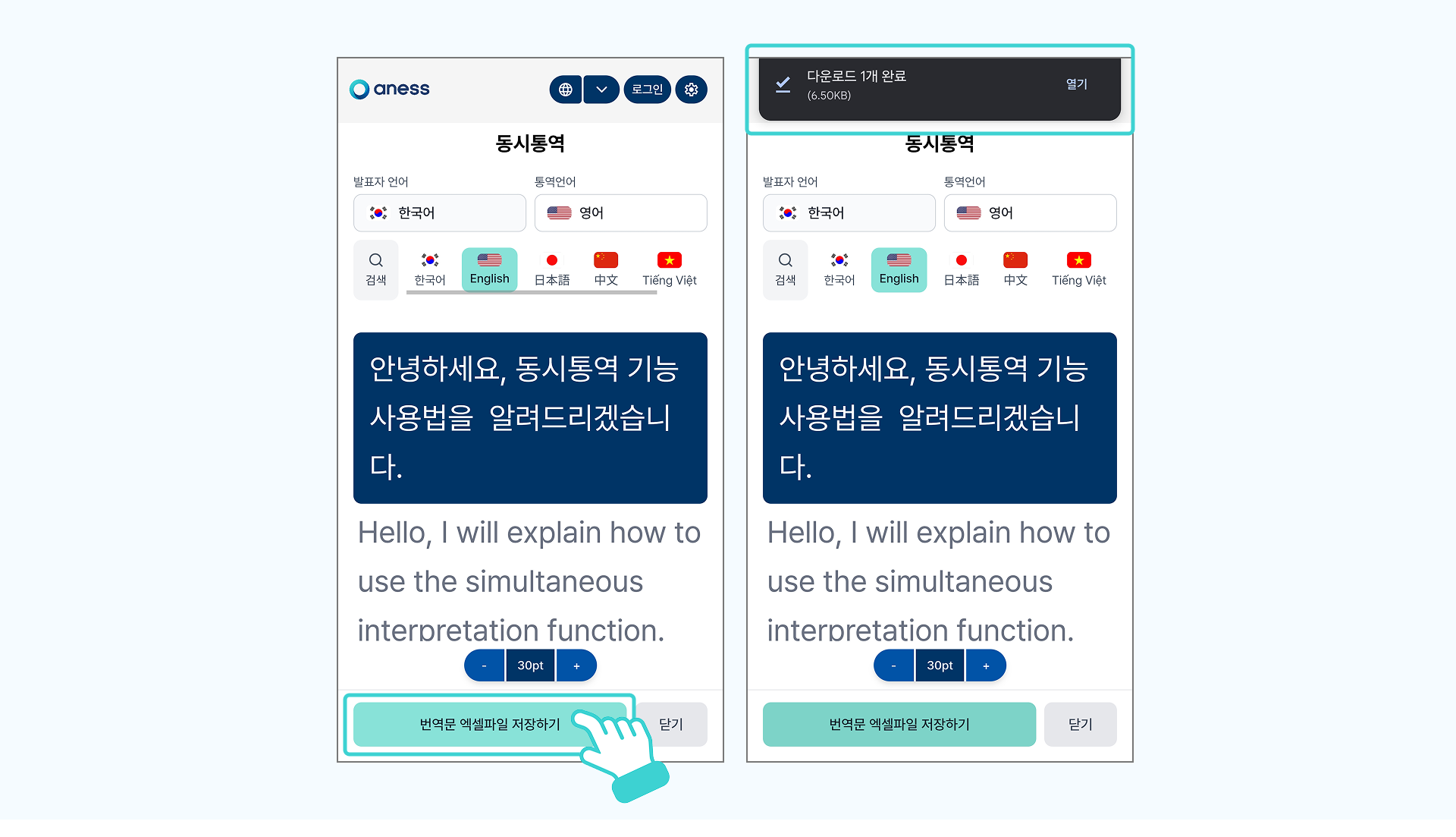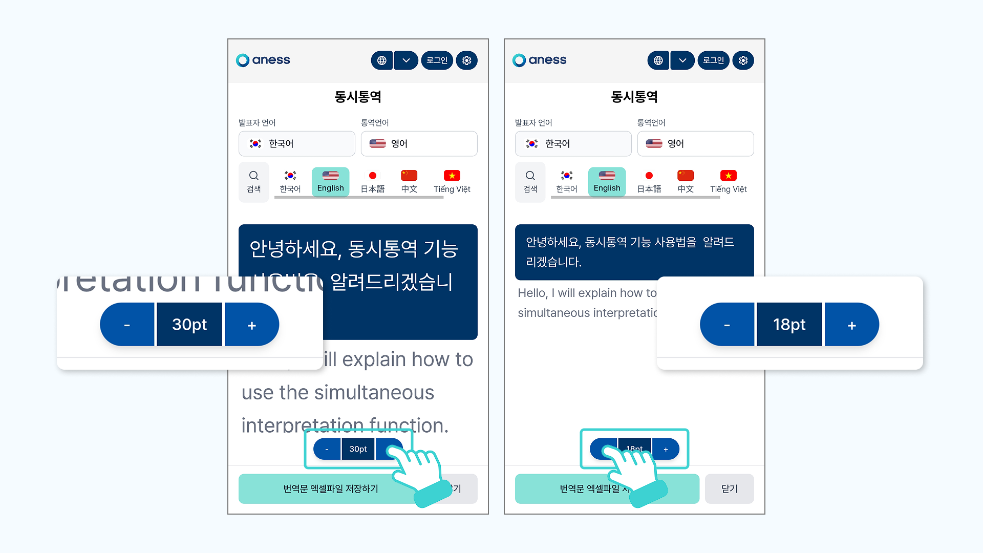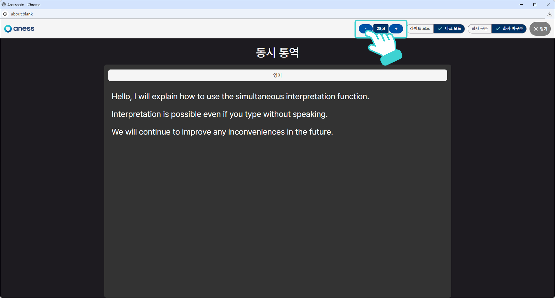 하단 중앙의 [+]를 누르면 통역문 글자의 크기가 커지고, [-]를 누르면 작아집니다.