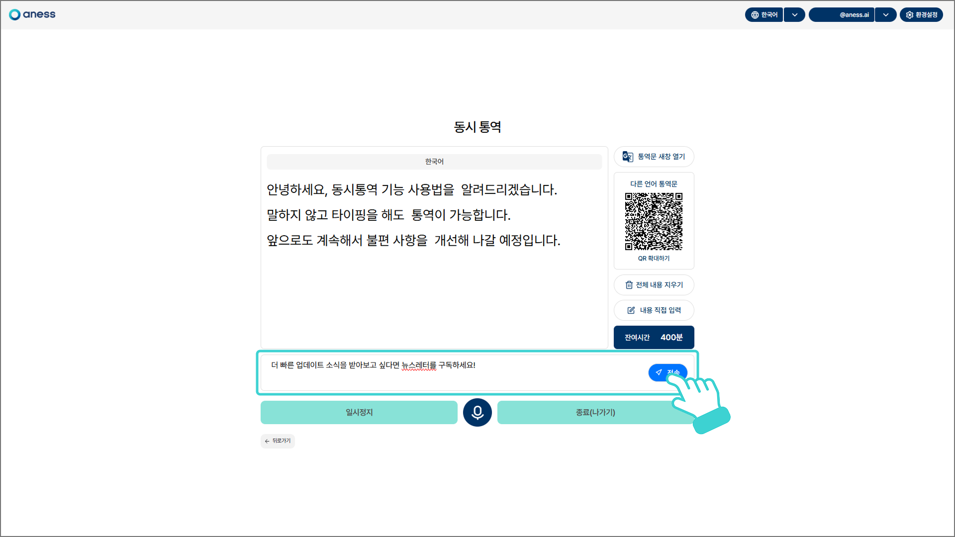 하단에 생성되는 입력칸에 통역 희망하는 텍스트를 입력한 후 [전송]을 클릭합니다.