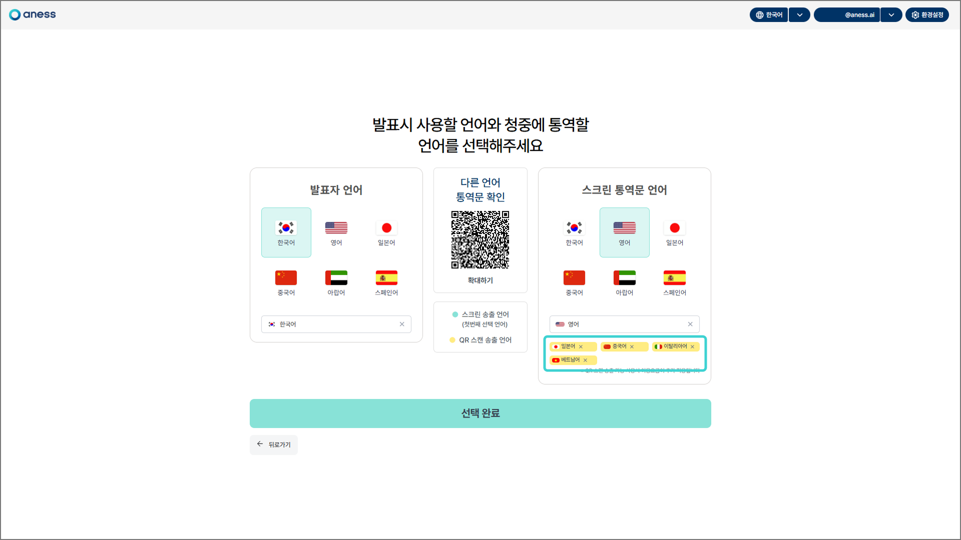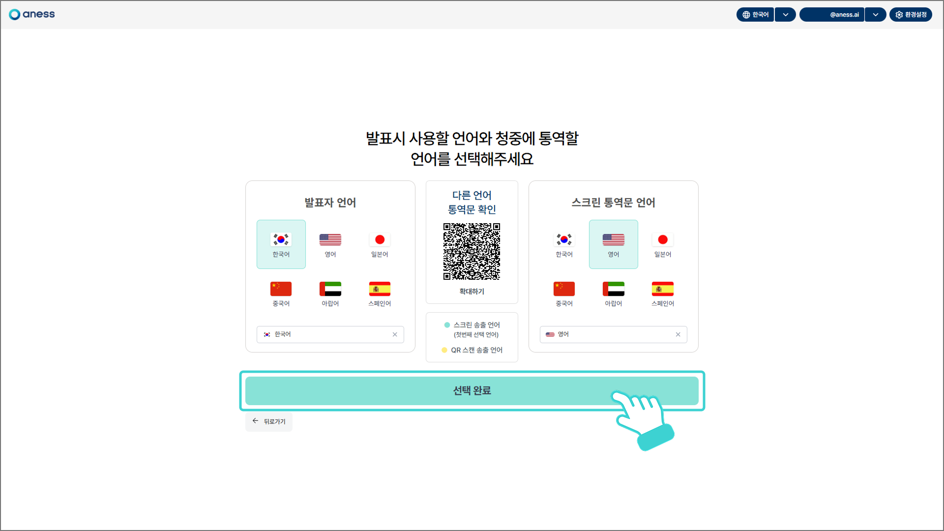 발표자의 발화 언어와 통역문 언어를 선택한 후, 하단의 [선택 완료]를 클릭합니다.