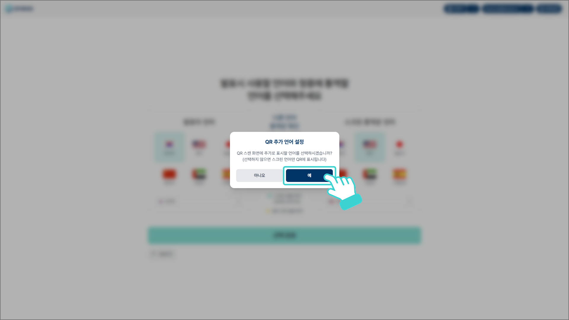 청중의 개인 디바이스로 다국어 통역 송출이 필요한 경우, QR 추가 언어 설정 팝업창의 [예]를 클릭합니다. (불필요한 경우 9번으로 넘어가세요)