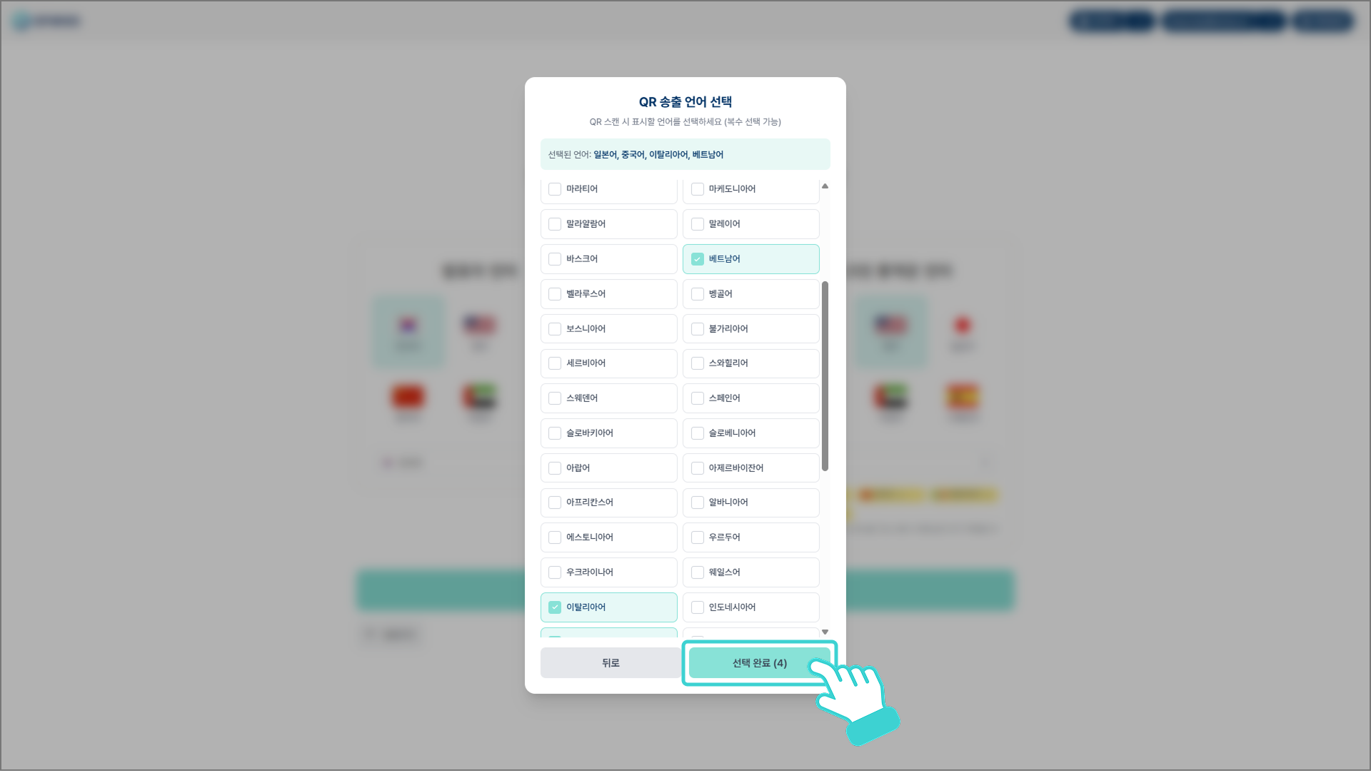 송출할 통역 언어를 모두 선택한 후 하단 우측의 [선택 완료]를 클릭하면, 우측의 '스크린 통역문 언어' 박스에 선택한 언어들이 노란색으로 표기됩니다.