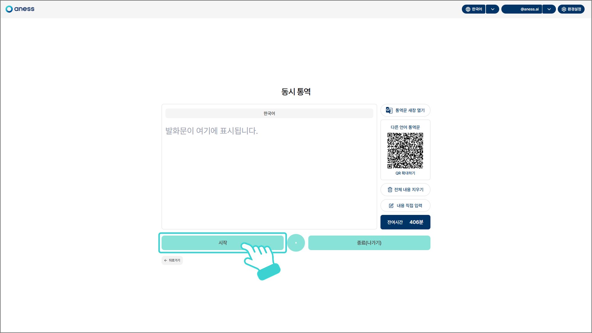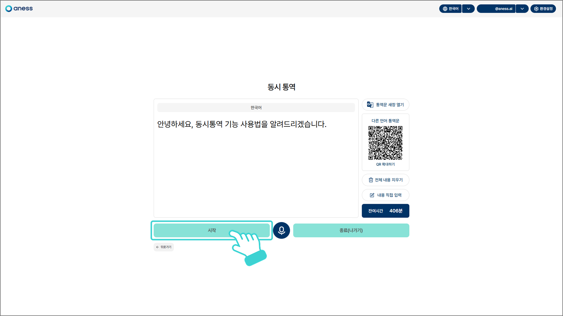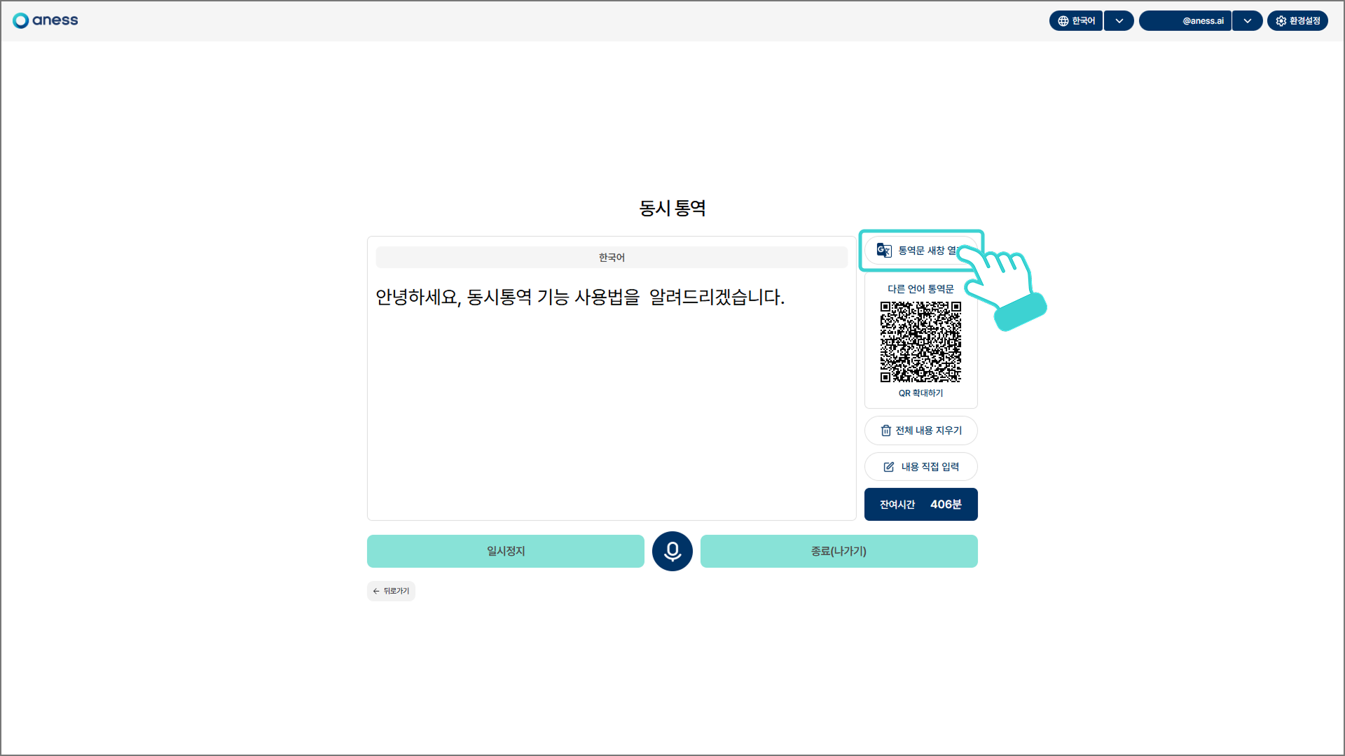 [시작] 버튼을 클릭하면 통역이 재개됩니다.