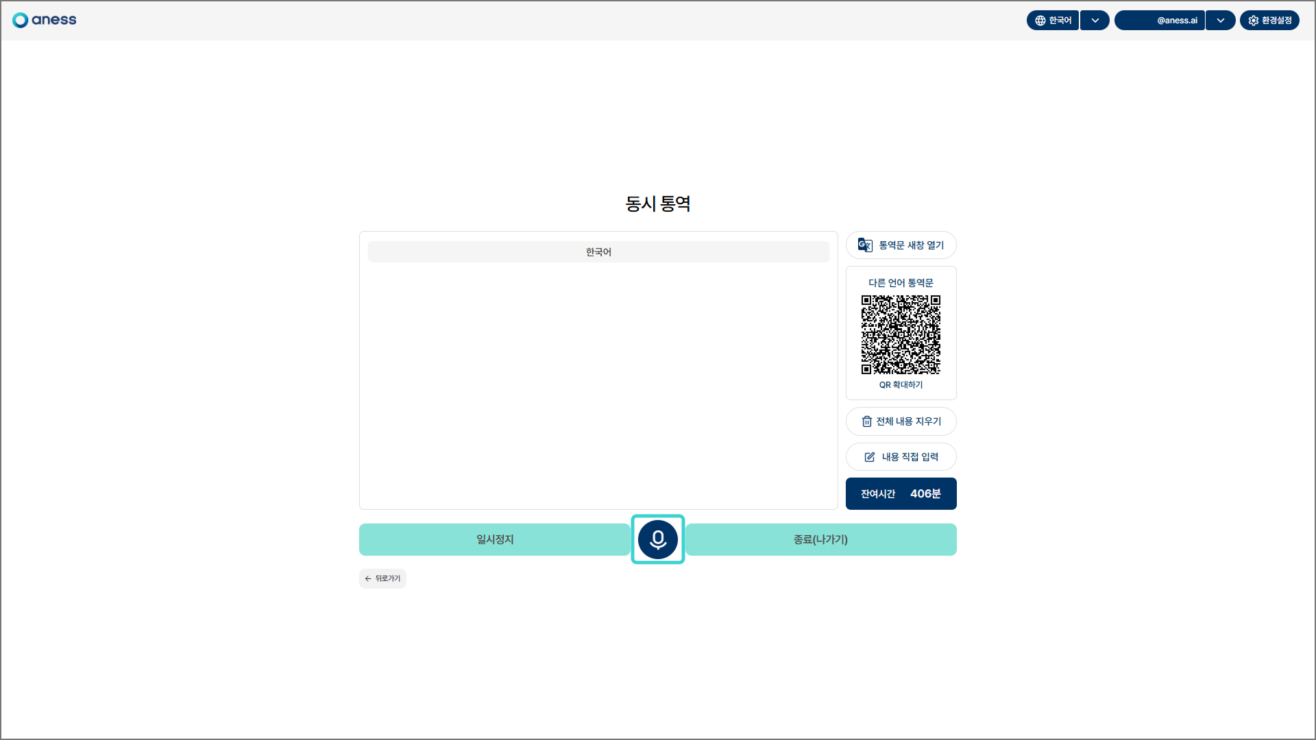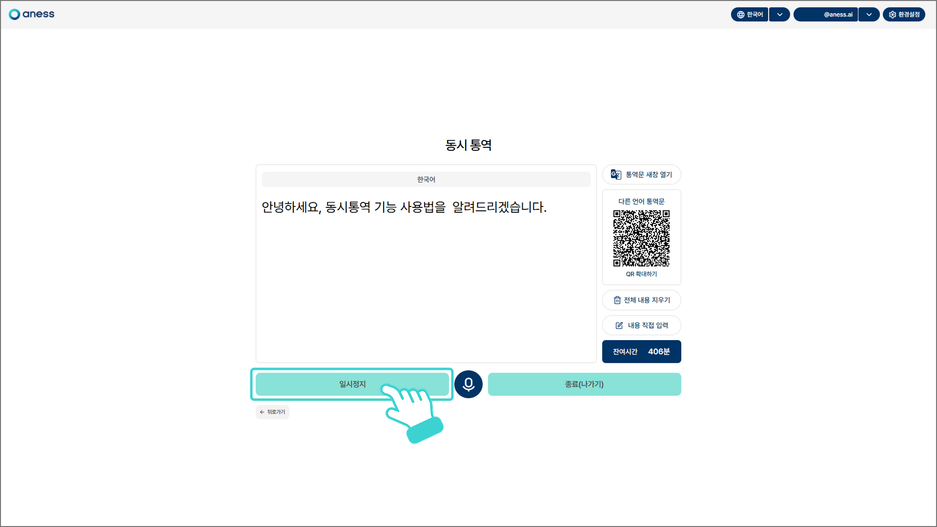 하단 좌측의 [일시정지]를 클릭하면 통역이 일시 중지되며, [시작] 버튼으로 변경됩니다.