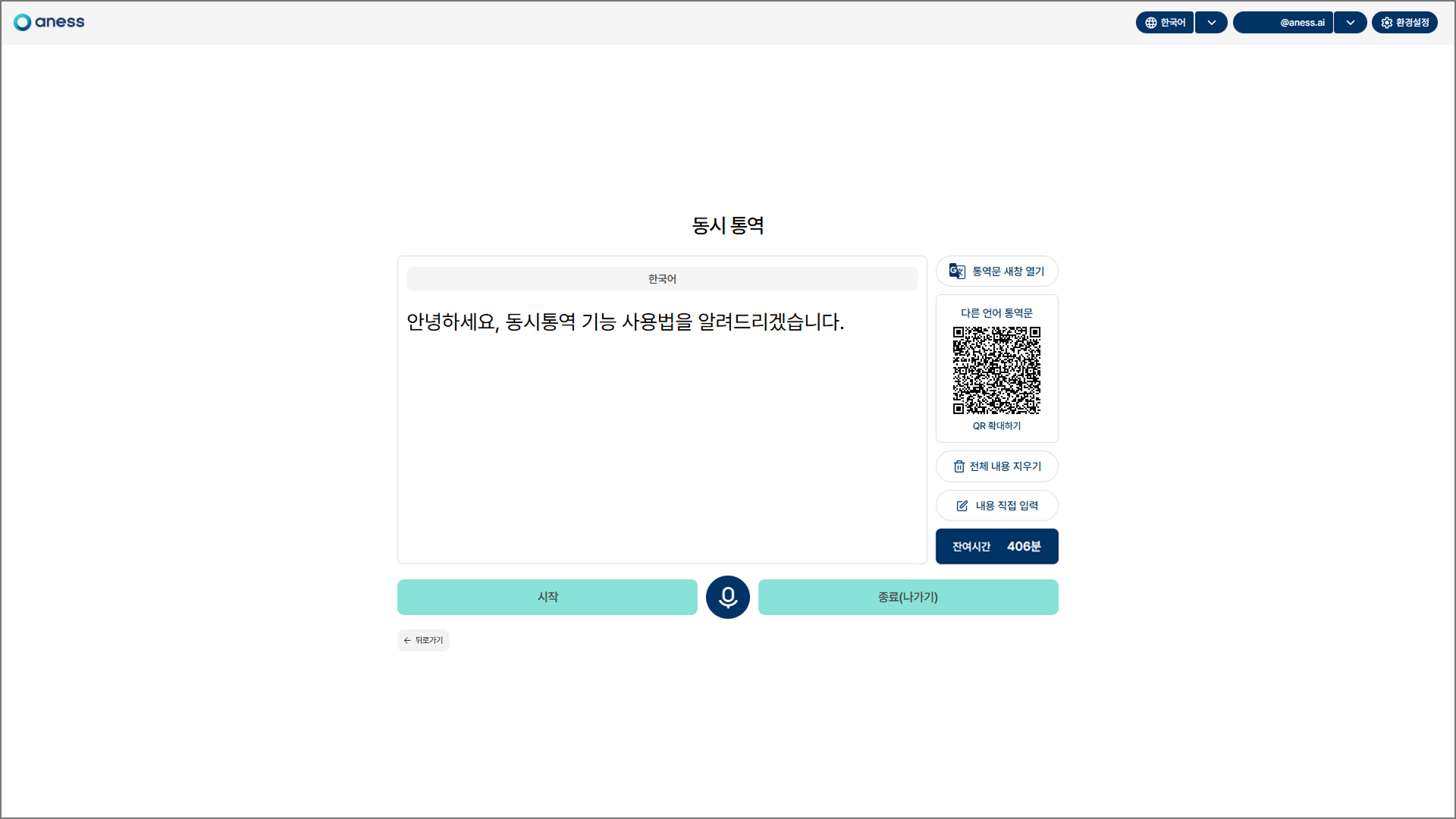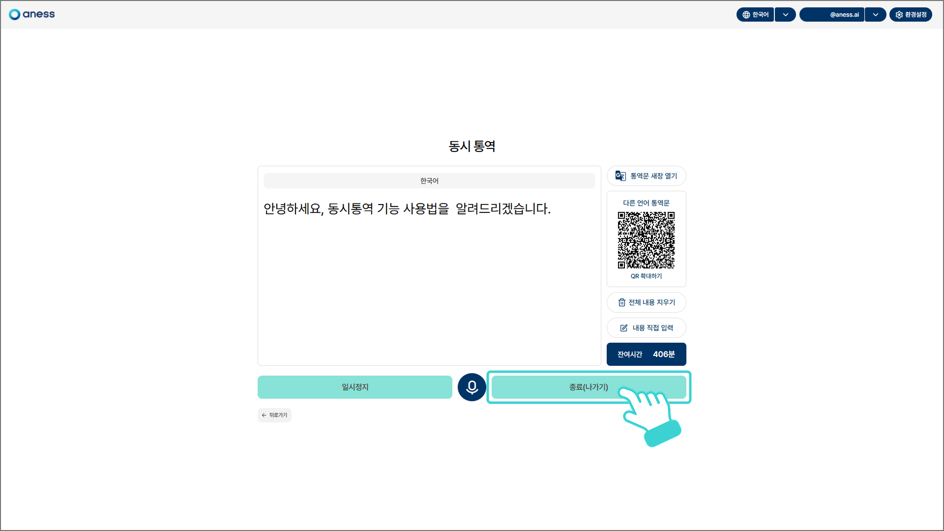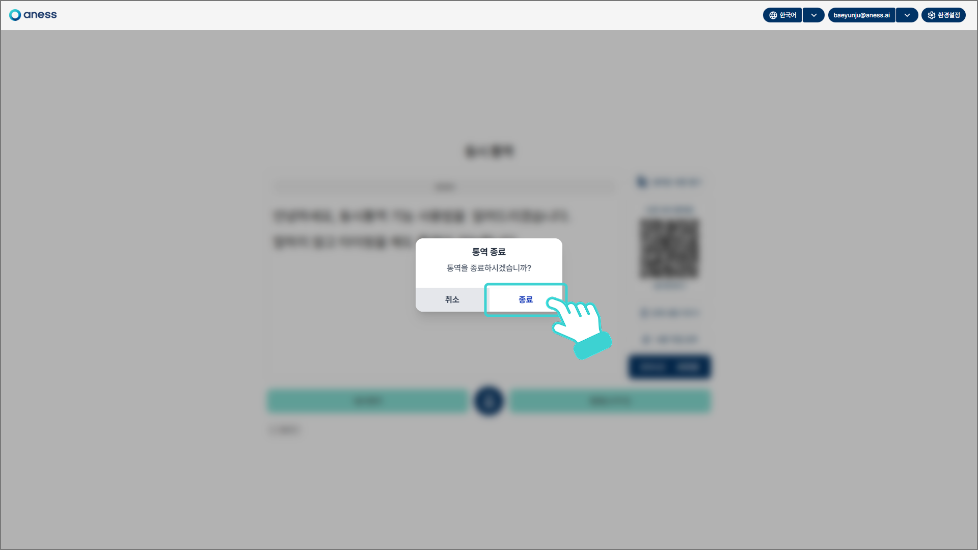 통역 종료 여부를 묻는 팝업창 [종료]를 클릭하면 통역이 종료되며 아네스노트 첫 화면으로 돌아갑니다.