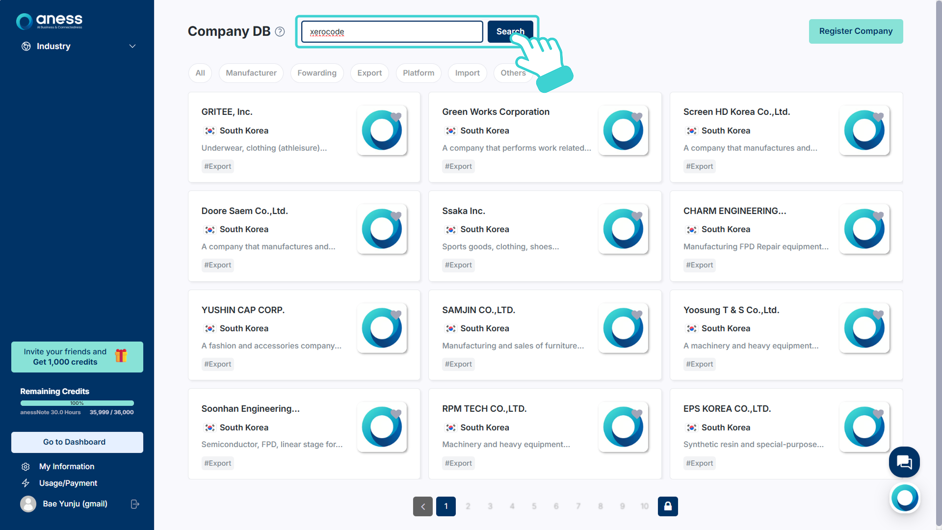 상단의 검색창에 기업명 전체 혹은 일부를 입력하고 [Search]를 클릭합니다.
