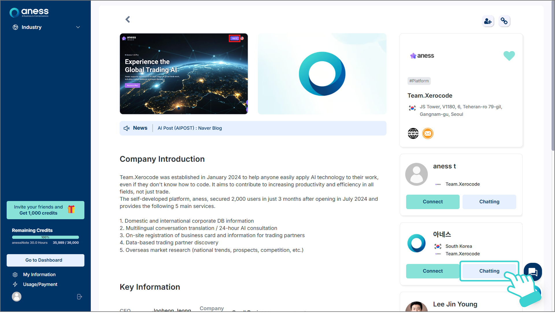 기업 페이지 우측의 소속원 리스트 중 일촌을 맺고 싶은 사람 프로필의 [Chatting]을 클릭합니다.