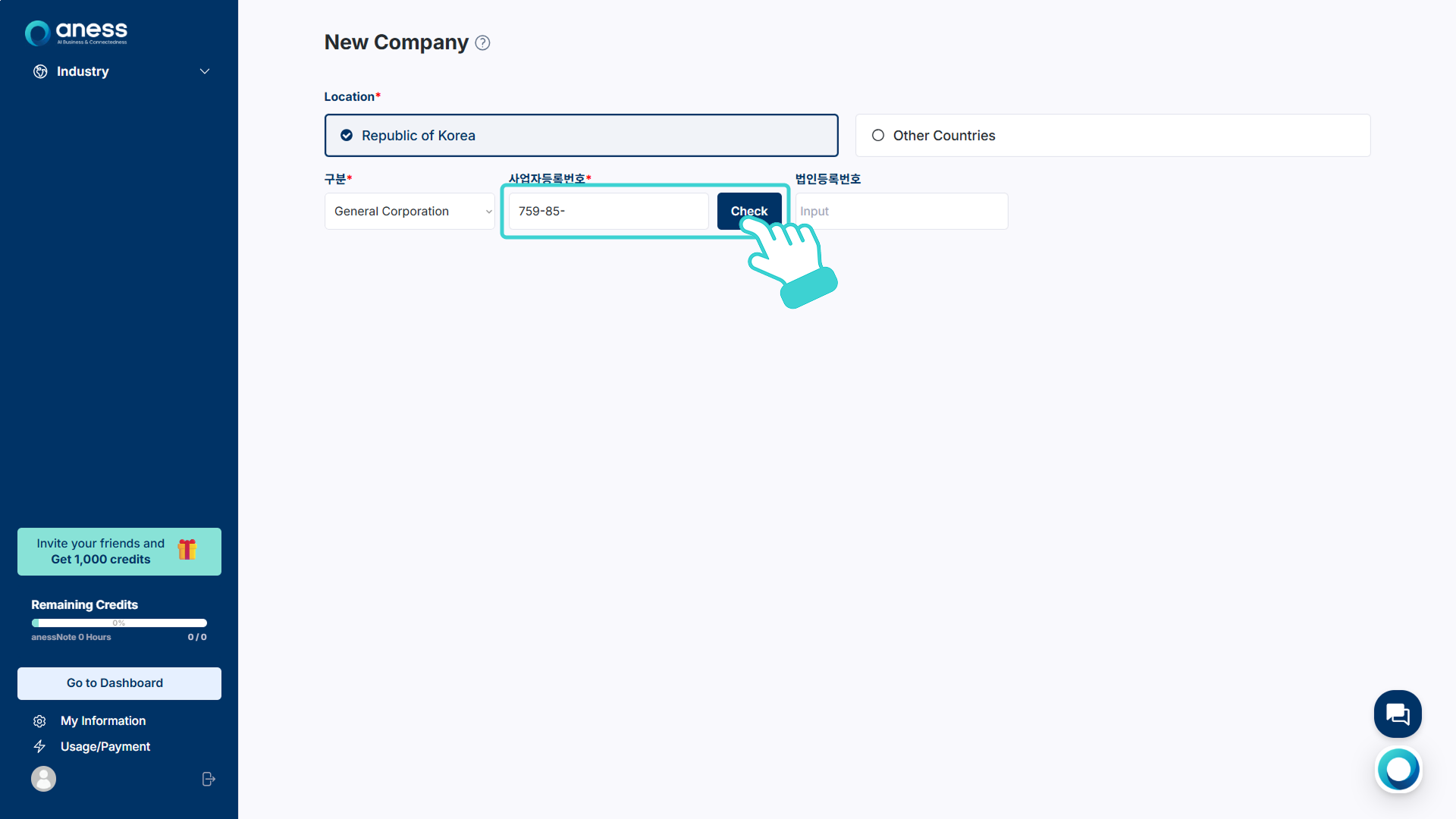 기업 소재지 국가와 구분을 선택하고 사업자 등록 번호를 입력한 뒤 [Check]를 클릭합니다.