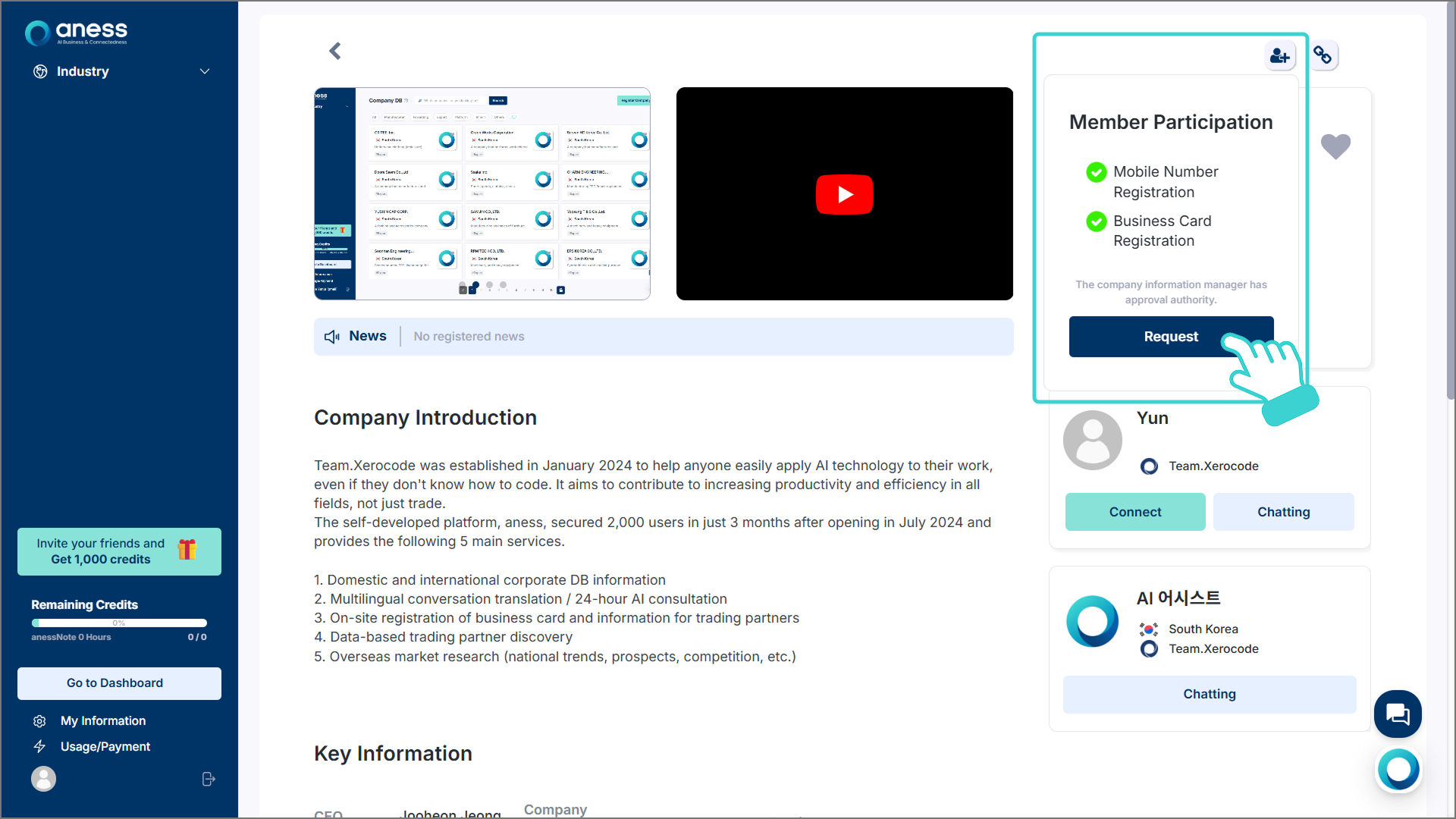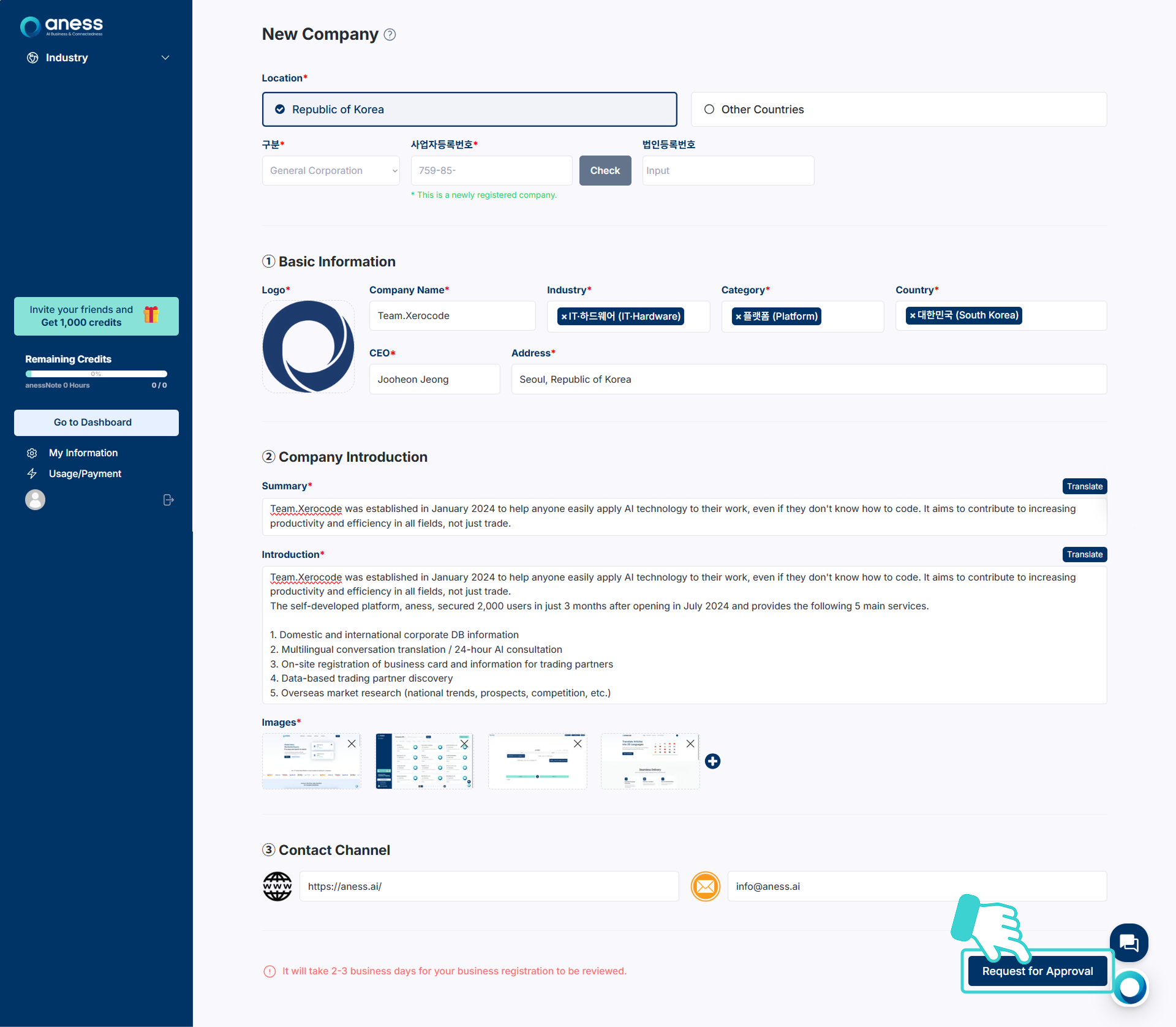 이미 등록된 기업이 아닐 시 나타나는 추가 사항들을 입력한 후, 우측 하단의 [Request for Approval]을 클릭합니다.