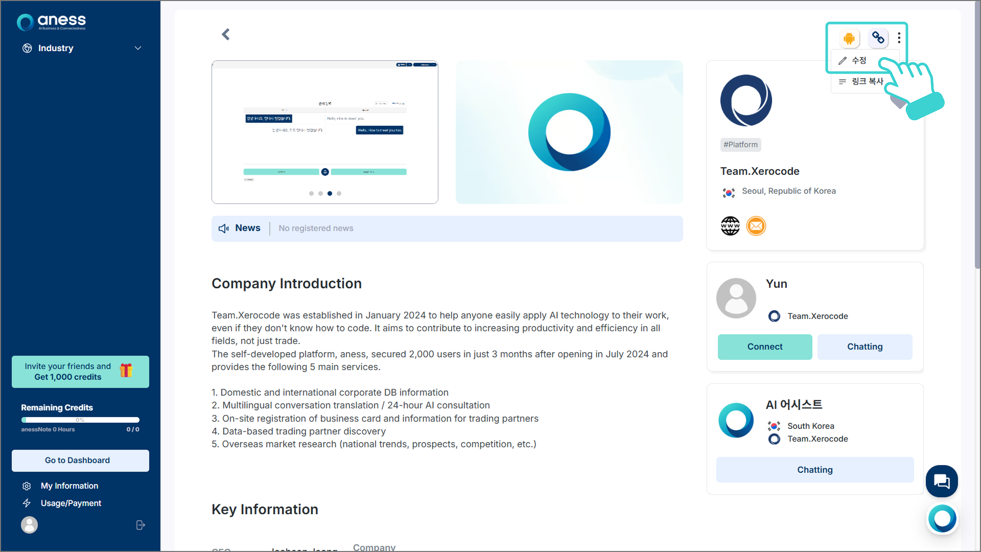 담당하는 기업의 정보 페이지에서 우측 상단의 [⁝]>[수정]을 클릭합니다.