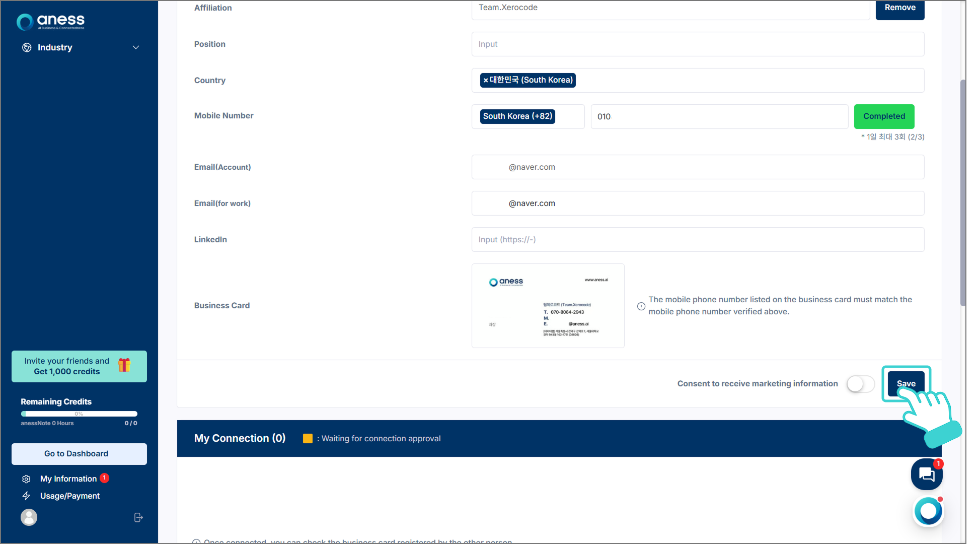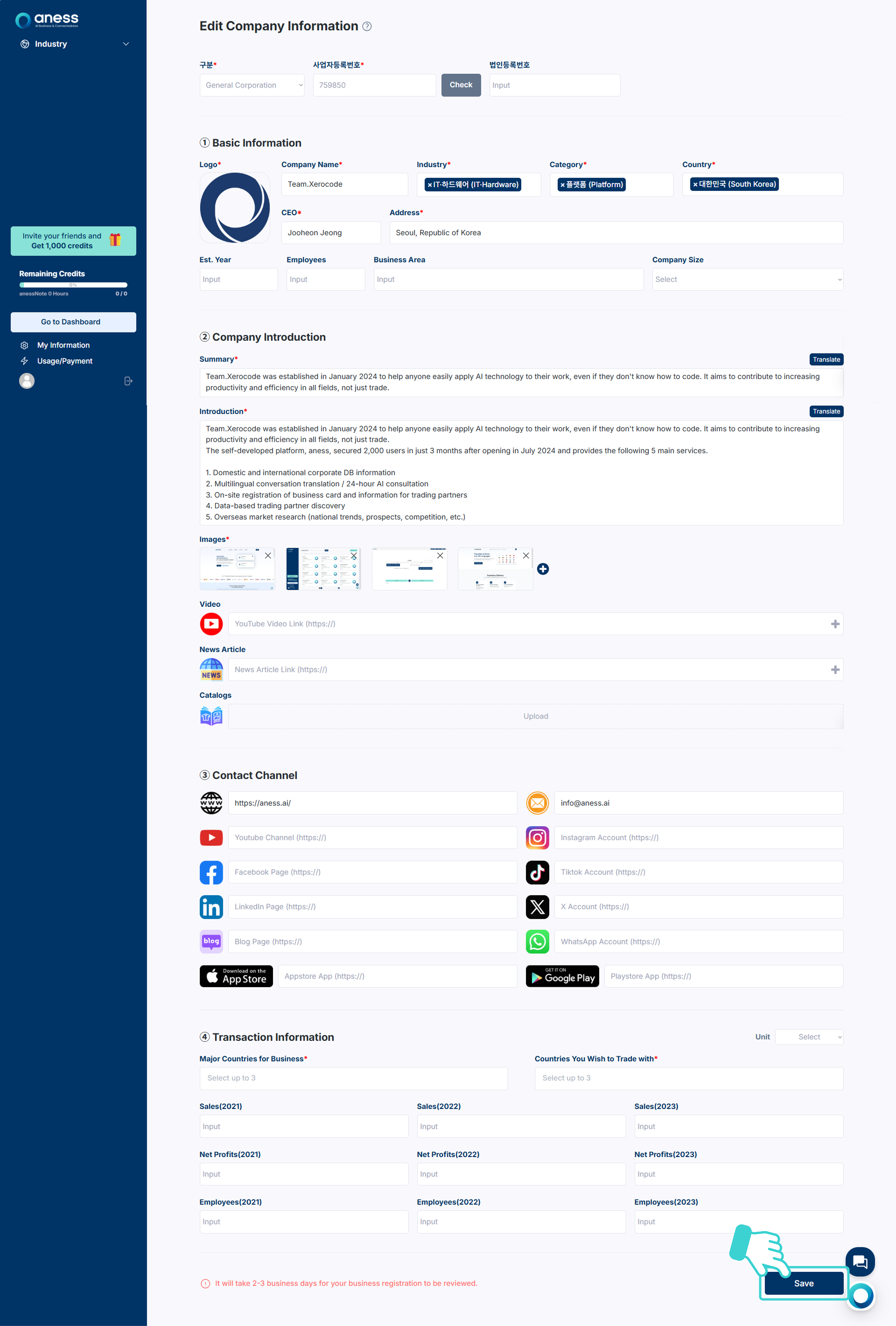 기업 정보를 수정 및 보완하고 하단의 [Save]를 클릭합니다.