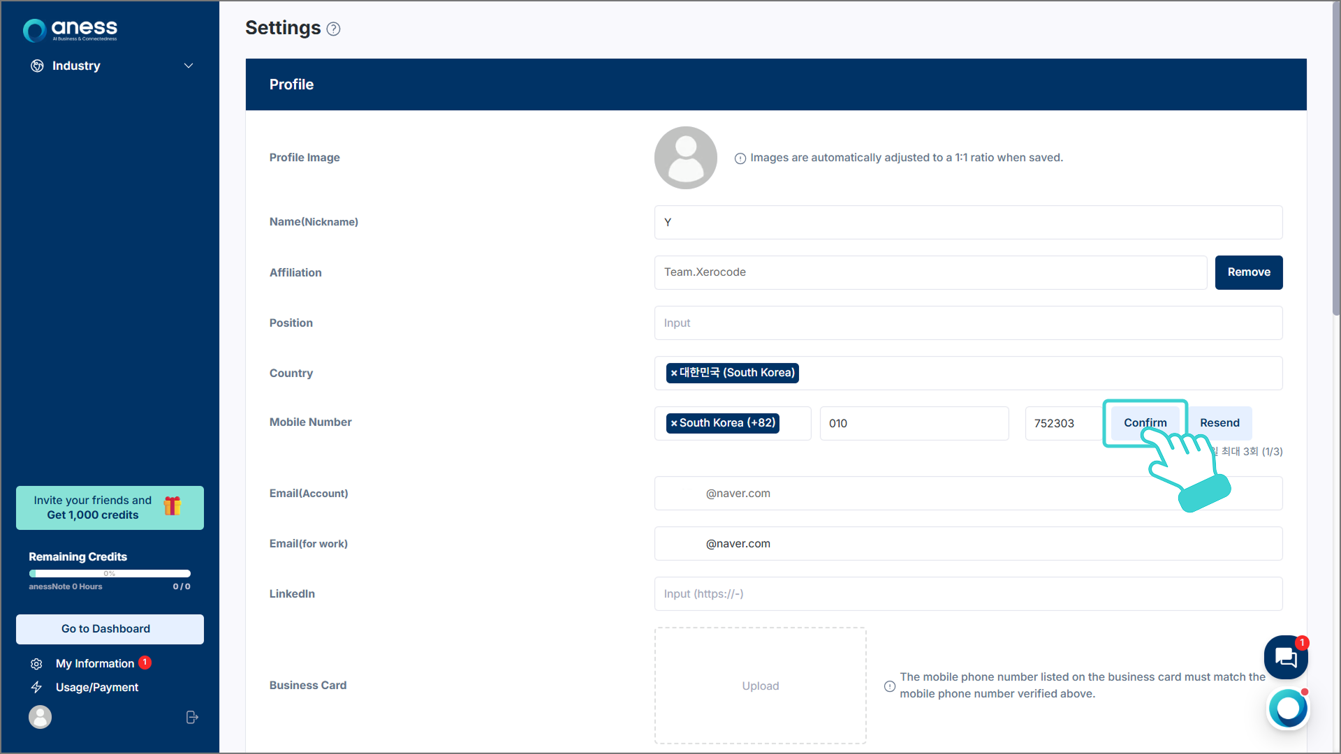 새로 생성된 'Code' 칸에 연락처로 발송된 문자의 인증번호를 입력하고 [Confirm]을 클릭합니다.