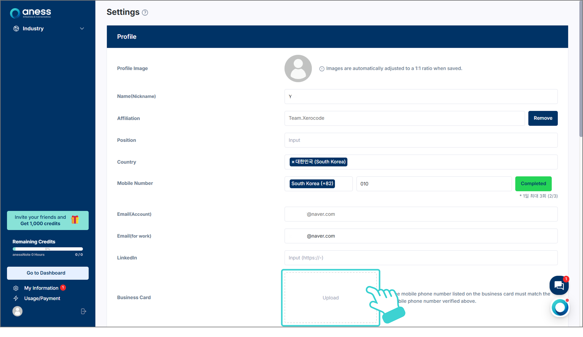 'Business Card' 항목의 [Upload] 박스를 클릭하여 명찰 이미지를 업로드합니다.