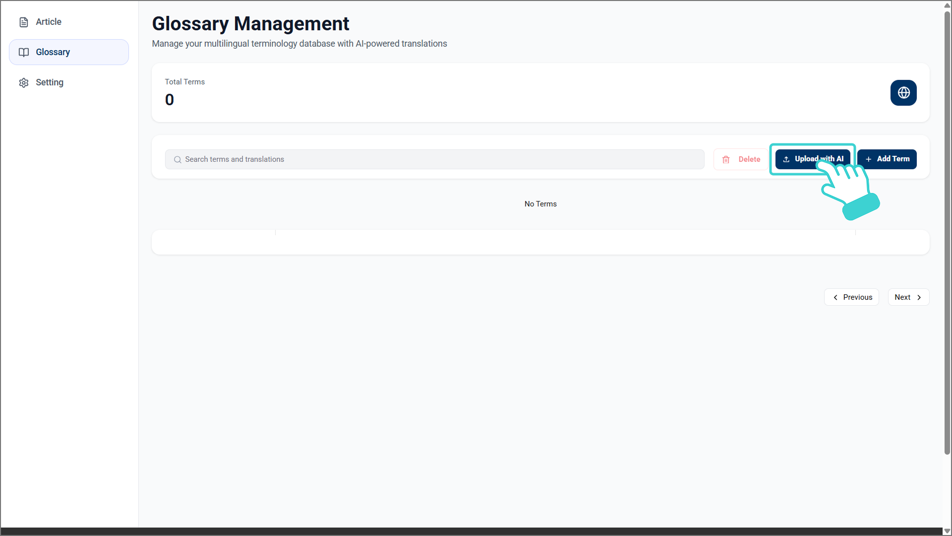 좌측 메뉴바의 [Glossary] 메뉴에 들어가 [Upload with AI]를 클릭합니다.