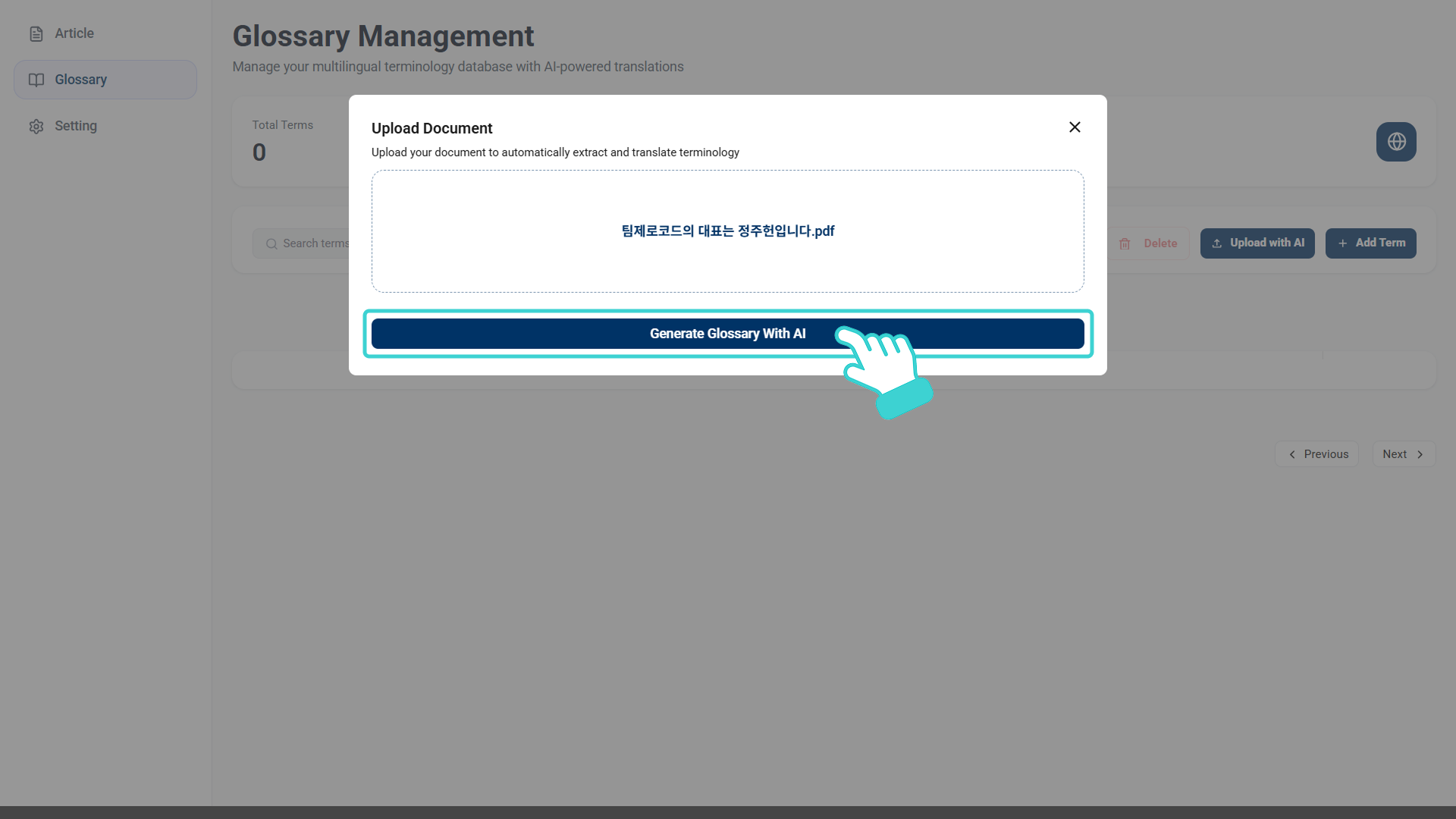 [Click to upload a Document]를 클릭해서 텍스트가 입력되어 있는 pdf 파일을 첨부하고, [Generate Glossary With AI]를 클릭합니다.