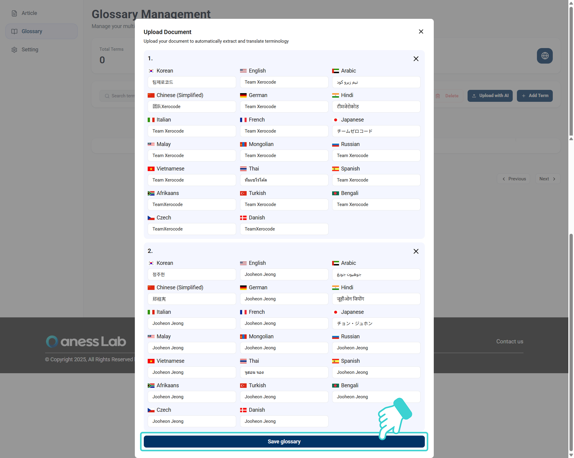 인식된 키워드와 번역 표현이 맞는지 확인하고 수정한 뒤, 하단의 [Save glossary]를 클릭합니다.