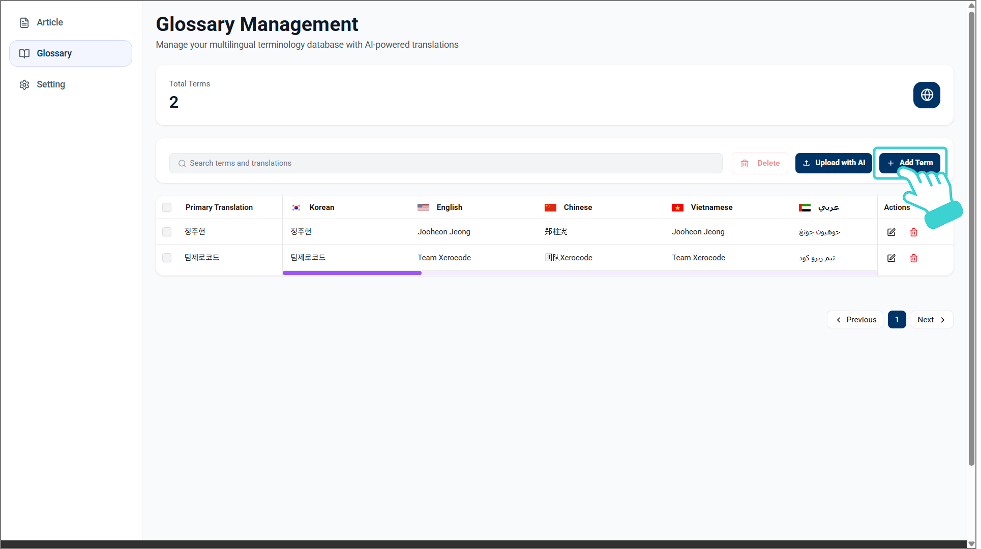 좌측 메뉴바의 [Glossary] 메뉴에 들어가 [Add Term]을 클릭합니다.
