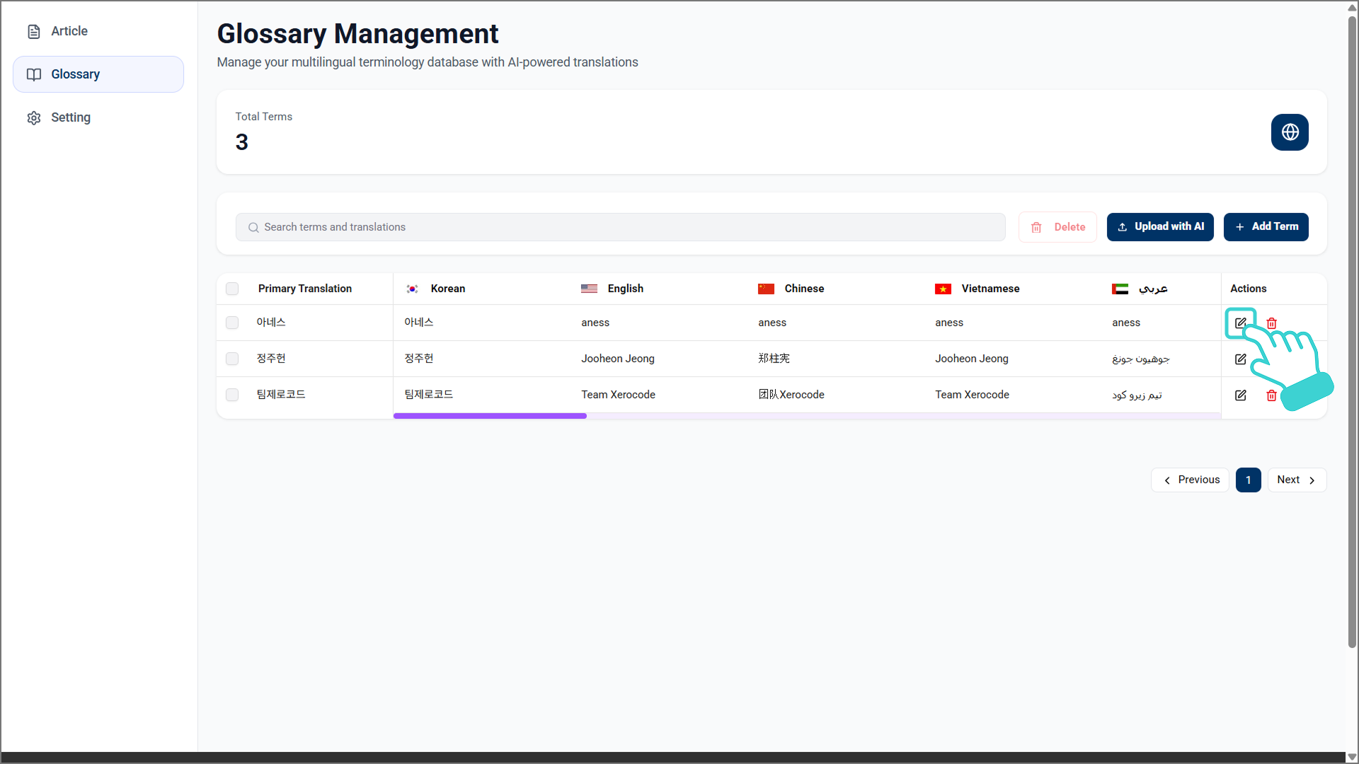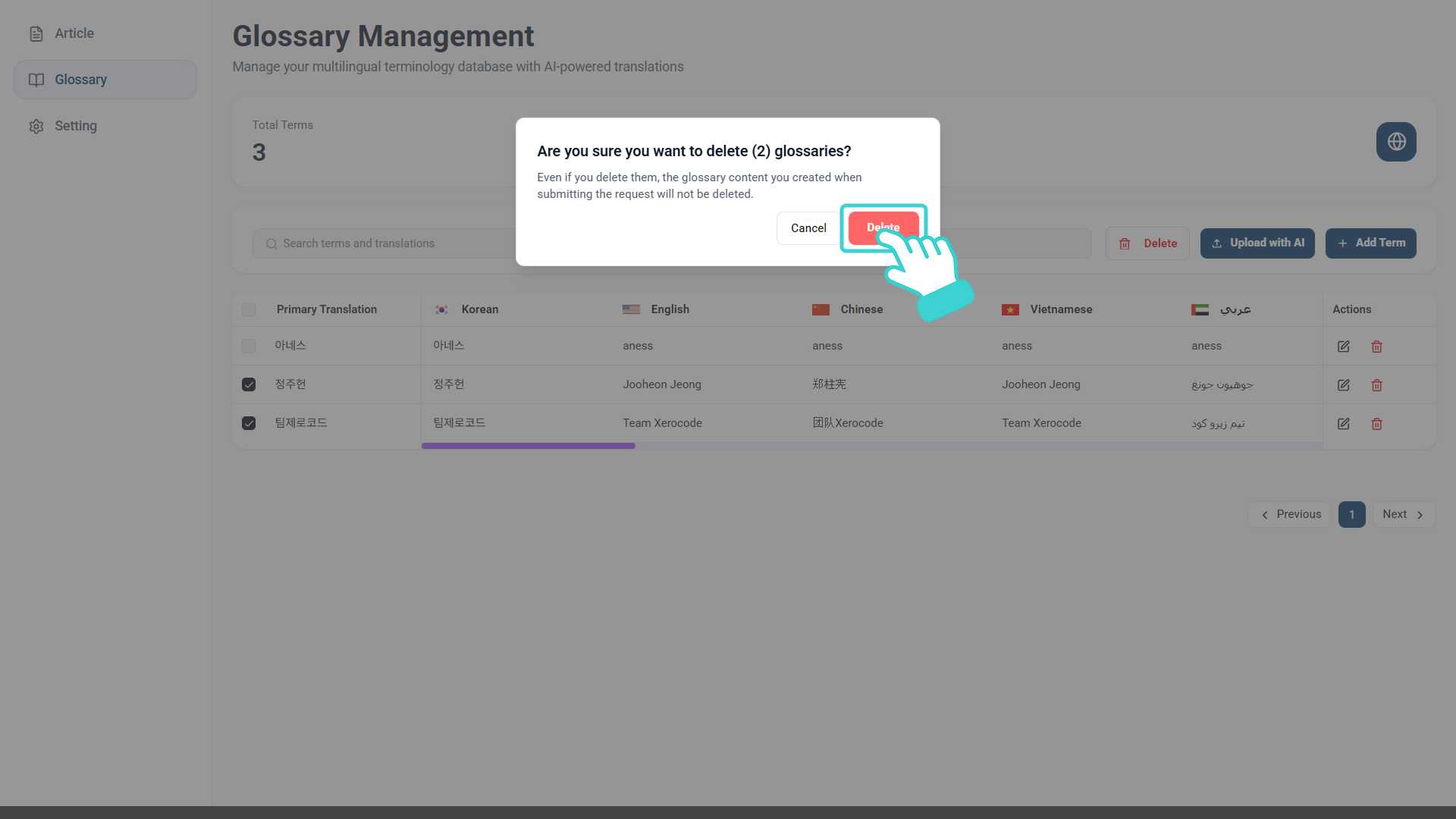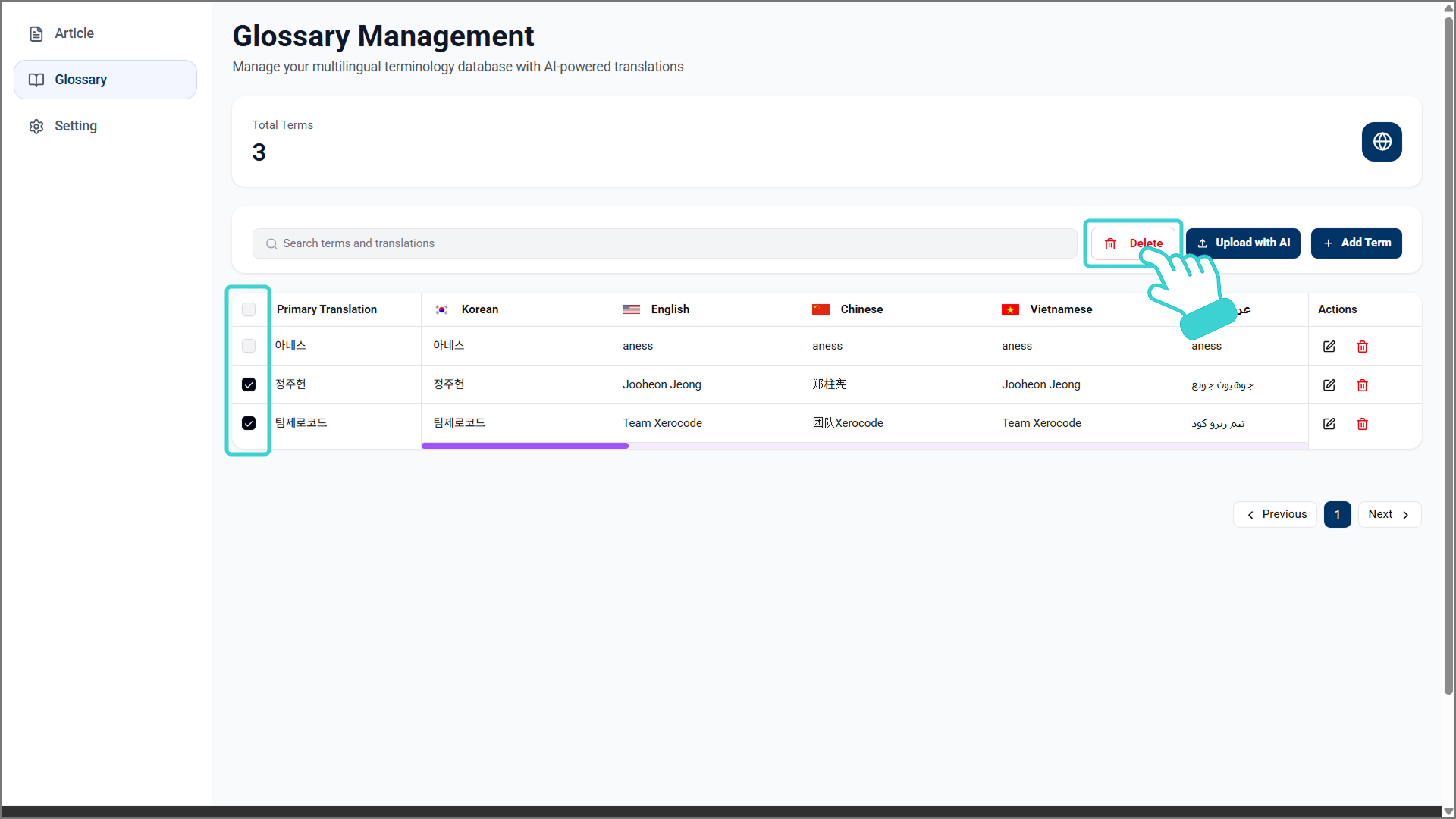 용어집 리스트에서 삭제하고자 하는 용어의 체크박스를 선택하고 검색창 우측의 [Delete]을 클릭합니다.