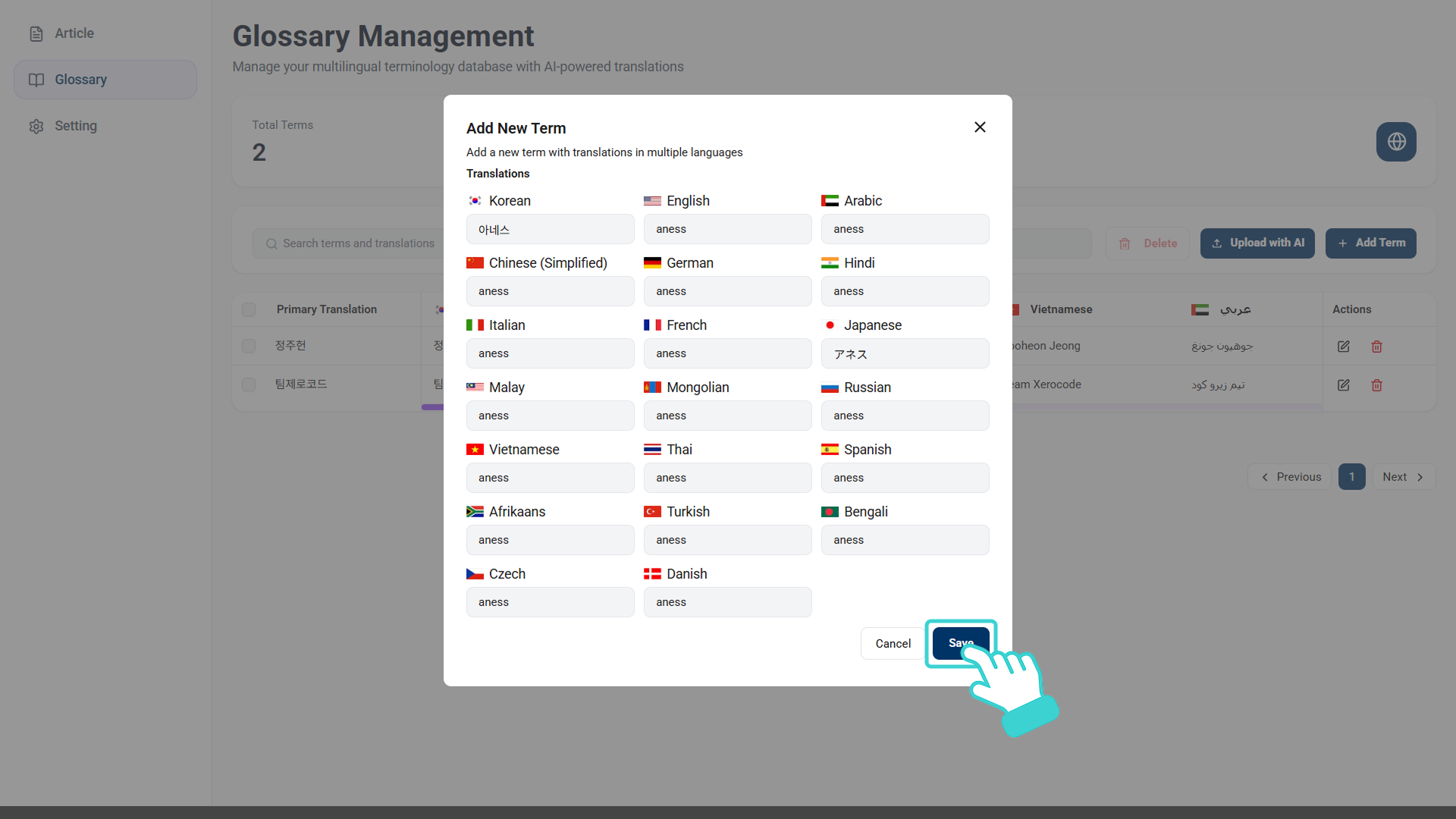 용어집에 추가할 용어를 입력하고 하단의 [Save]를 클릭합니다.
